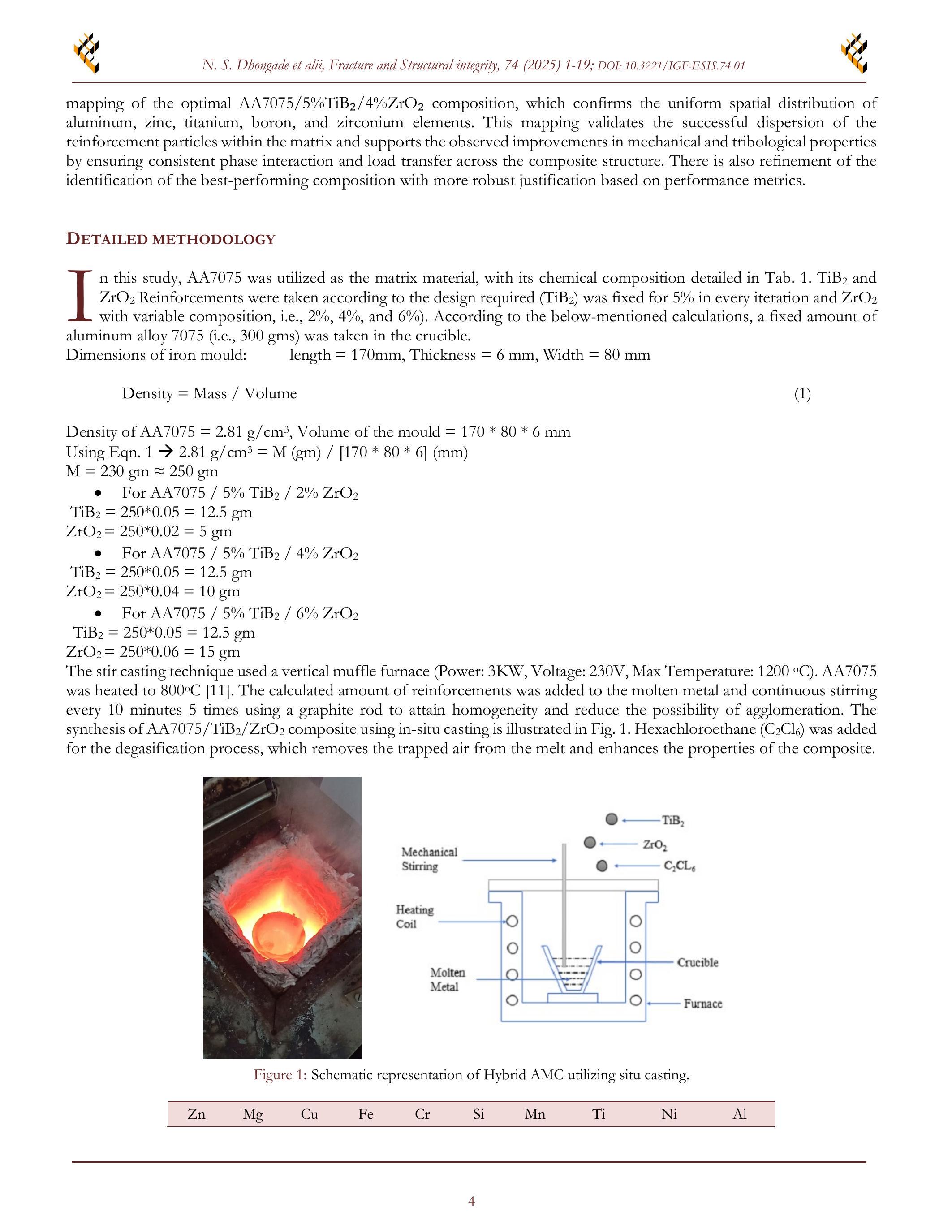 In this study, AA7075 was utilized as the matrix material, with its chemical composition detailed in Tab.1.TiB_(2)\mathrm{Tab} .1 . \mathrm{TiB}_{2} and ZrO_(2)\mathrm{ZrO}_{2} Reinforcements were taken according to the design required ( TiB_(2)\mathrm{TiB}_{2} ) was fixed for 5%5 \% in every iteration and ZrO_(2)\mathrm{ZrO}_{2} with variable composition, i.e., 2%,4%2 \%, 4 \%, and 6%6 \% ). According to the below-mentioned calculations, a fixed amount of aluminum alloy 7075 (i.e., 300 gms ) was taken in the crucible.