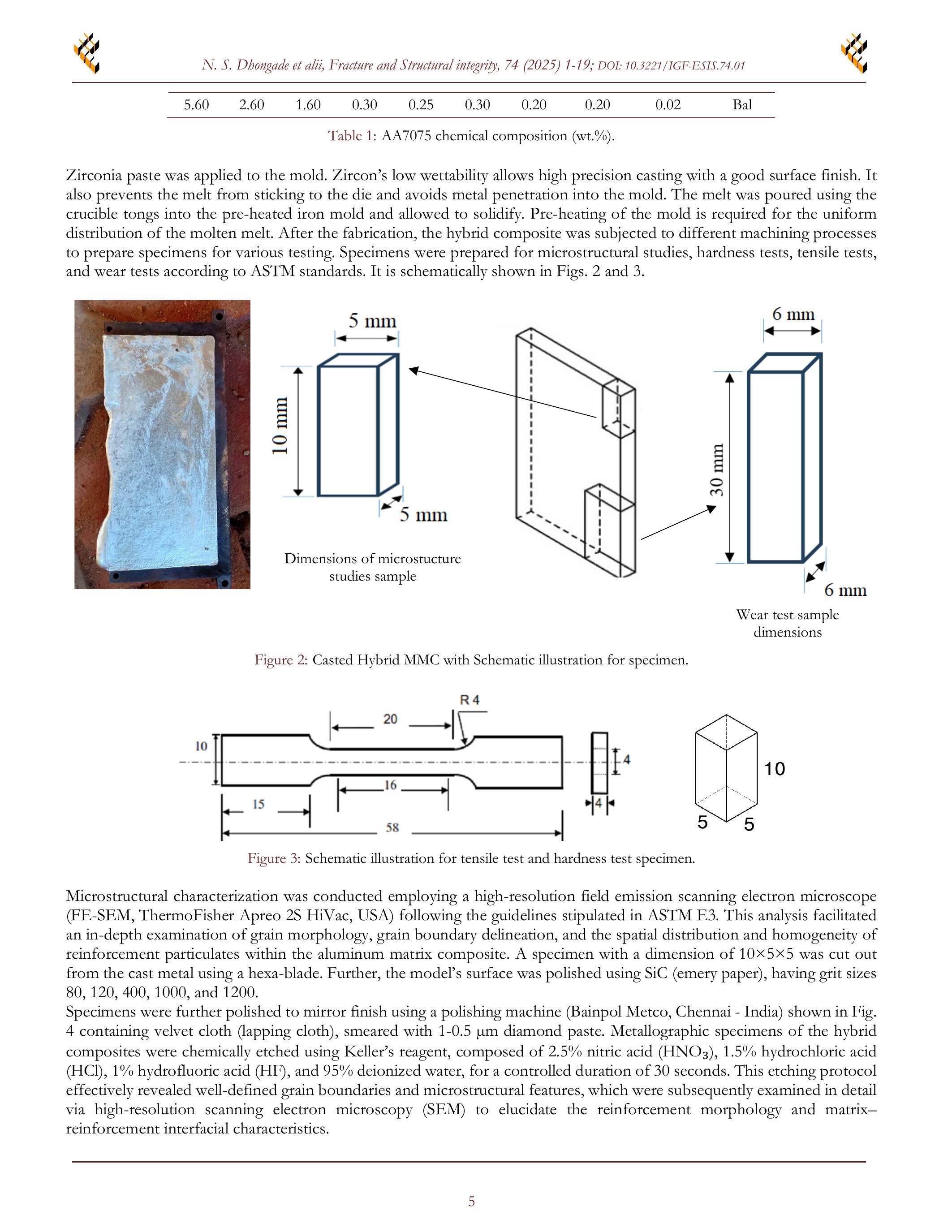 Zirconia paste was applied to the mold. Zircon's low wettability allows high precision casting with a good surface finish. It also prevents the melt from sticking to the die and avoids metal penetration into the mold. The melt was poured using the crucible tongs into the pre-heated iron mold and allowed to solidify. Pre-heating of the mold is required for the uniform distribution of the molten melt. After the fabrication, the hybrid composite was subjected to different machining processes to prepare specimens for various testing. Specimens were prepared for microstructural studies, hardness tests, tensile tests, and wear tests according to ASTM standards. It is schematically shown in Figs. 2 and 3.