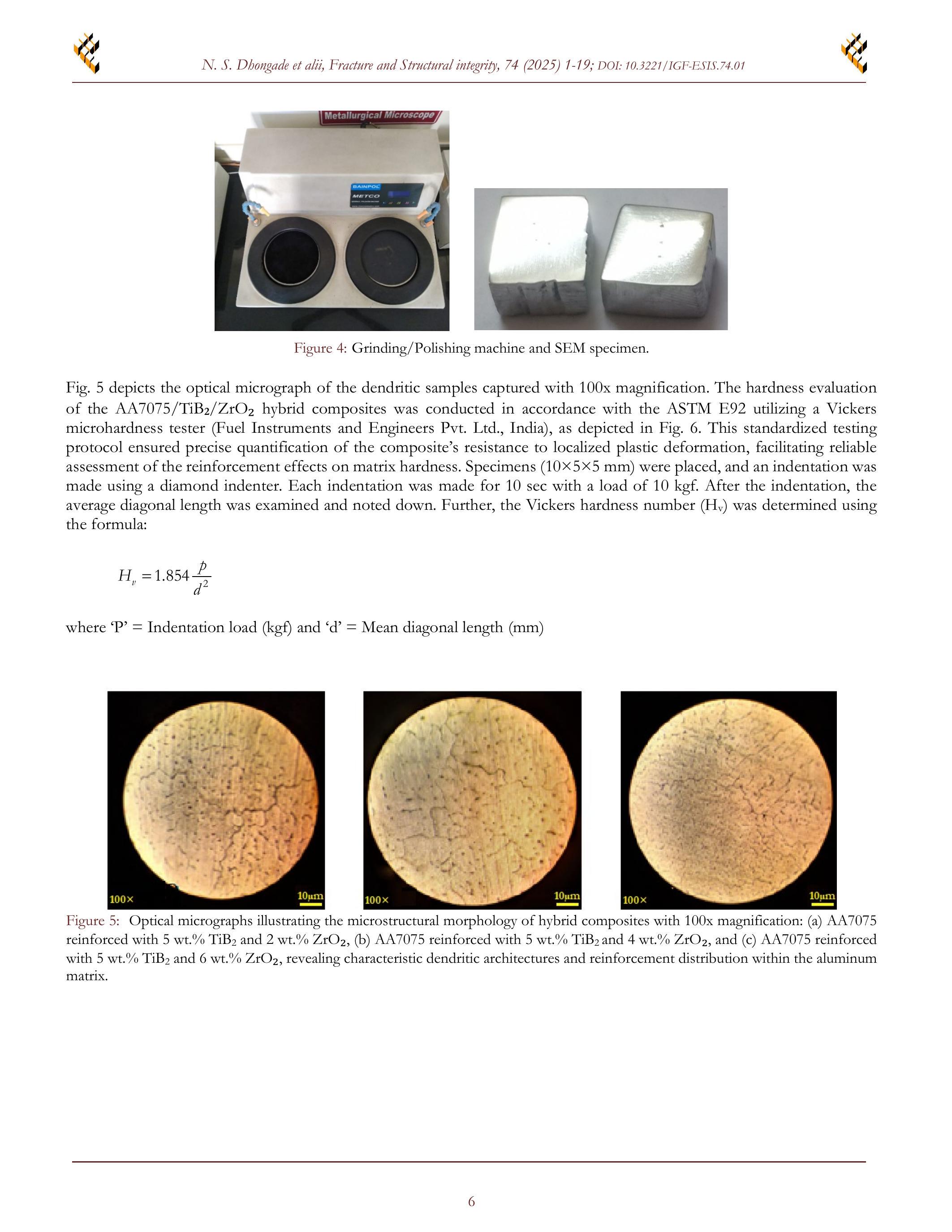 Fig. 5 depicts the optical micrograph of the dendritic samples captured with 100 x magnification. The hardness evaluation of the AA7075//TiB_(2)//ZrO_(2)\mathrm{AA} 7075 / \mathrm{TiB}_{2} / \mathrm{ZrO}_{2} hybrid composites was conducted in accordance with the ASTM E92 utilizing a Vickers microhardness tester (Fuel Instruments and Engineers Pvt. Ltd., India), as depicted in Fig. 6. This standardized testing protocol ensured precise quantification of the composite's resistance to localized plastic deformation, facilitating reliable assessment of the reinforcement effects on matrix hardness. Specimens ( 10 xx5xx5mm10 \times 5 \times 5 \mathrm{~mm} ) were placed, and an indentation was made using a diamond indenter. Each indentation was made for 10 sec with a load of 10 kgf . After the indentation, the average diagonal length was examined and noted down. Further, the Vickers hardness number ( H_(v)\mathrm{H}_{\mathrm{v}} ) was determined using the formula: