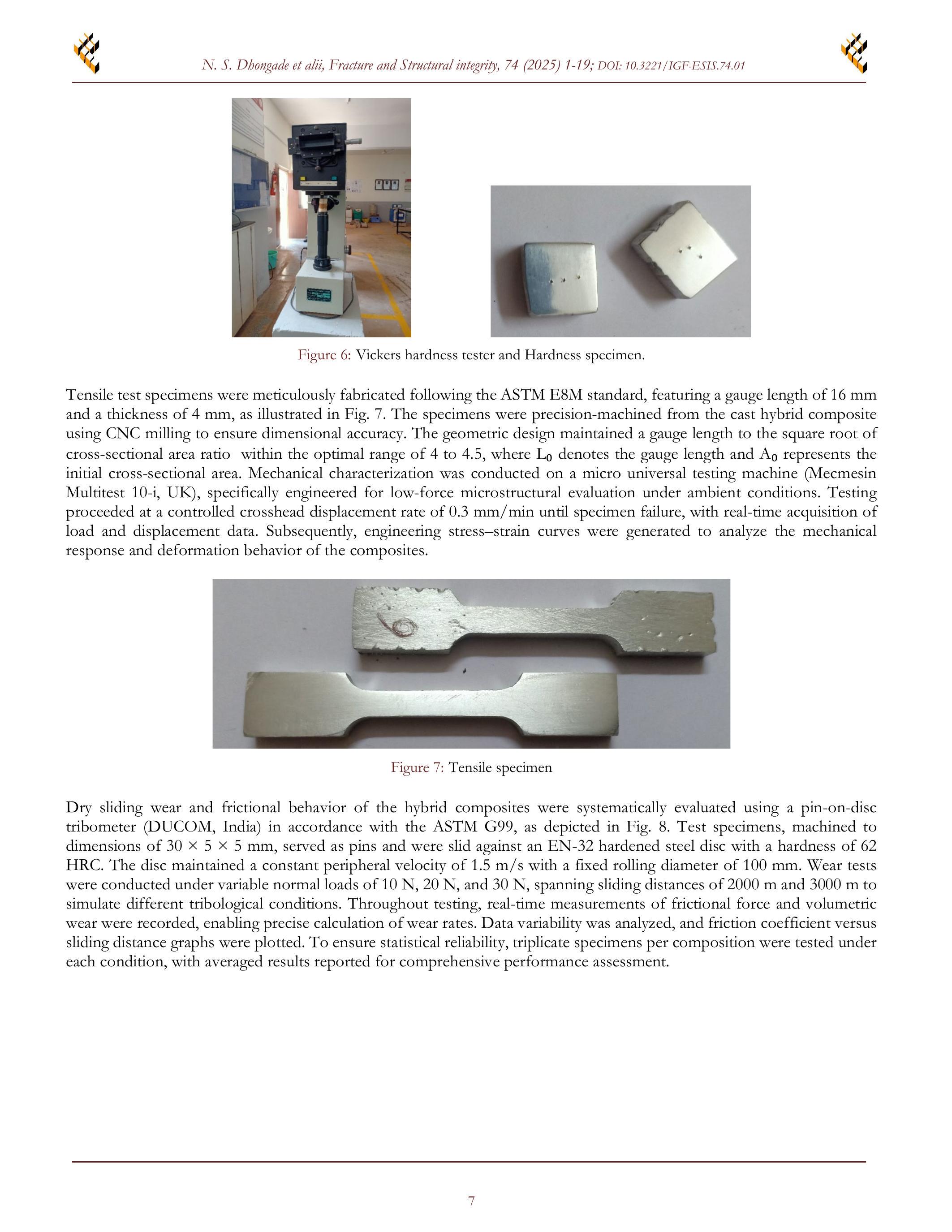 Tensile test specimens were meticulously fabricated following the ASTM E8M standard, featuring a gauge length of 16 mm and a thickness of 4 mm , as illustrated in Fig. 7. The specimens were precision-machined from the cast hybrid composite using CNC milling to ensure dimensional accuracy. The geometric design maintained a gauge length to the square root of cross-sectional area ratio within the optimal range of 4 to 4.5 , where L_(0)\mathrm{L}_{0} denotes the gauge length and A_(0)\mathrm{A}_{0} represents the initial cross-sectional area. Mechanical characterization was conducted on a micro universal testing machine (Mecmesin Multitest 10-i, UK), specifically engineered for low-force microstructural evaluation under ambient conditions. Testing proceeded at a controlled crosshead displacement rate of 0.3mm//min0.3 \mathrm{~mm} / \mathrm{min} until specimen failure, with real-time acquisition of load and displacement data. Subsequently, engineering stress-strain curves were generated to analyze the mechanical response and deformation behavior of the composites.