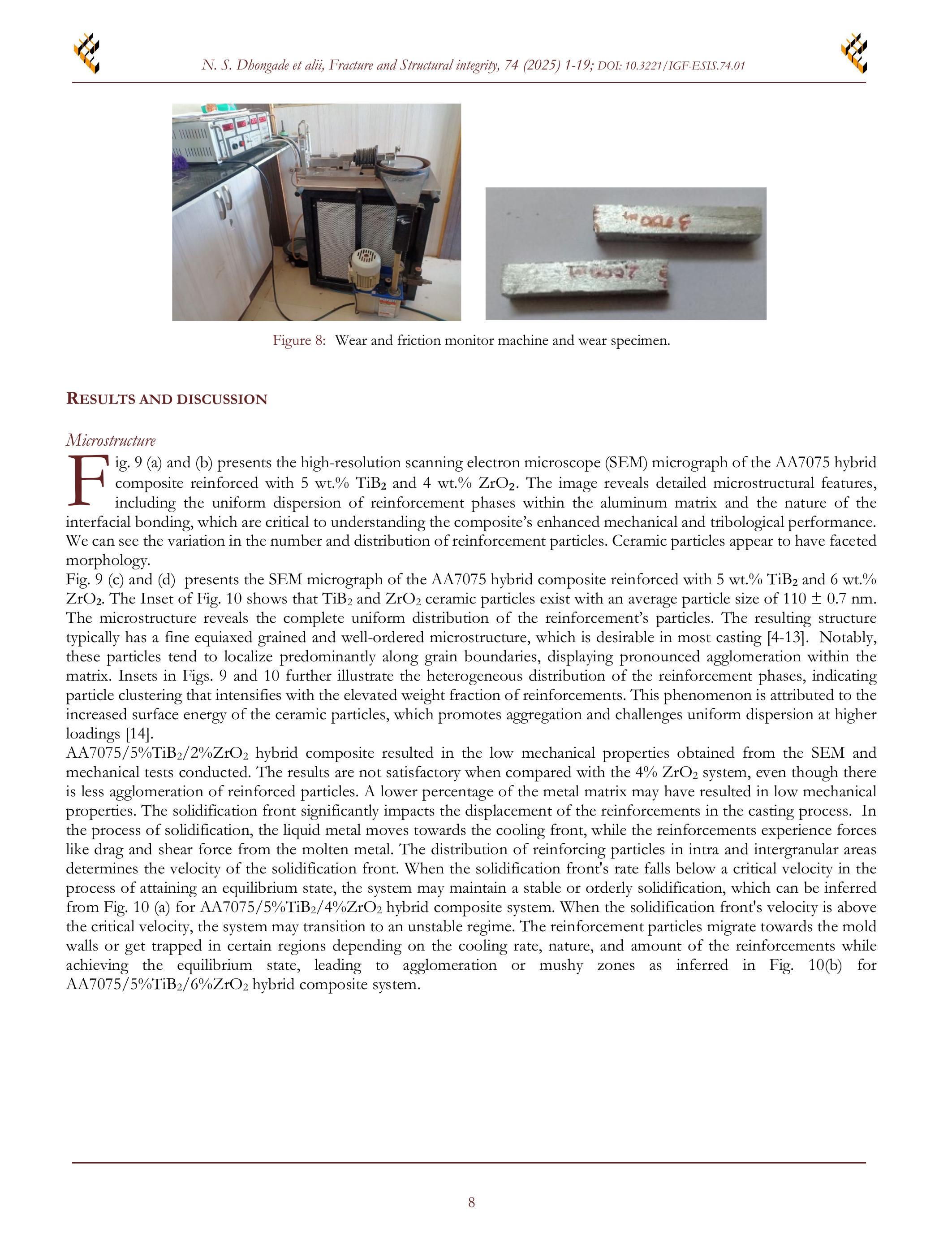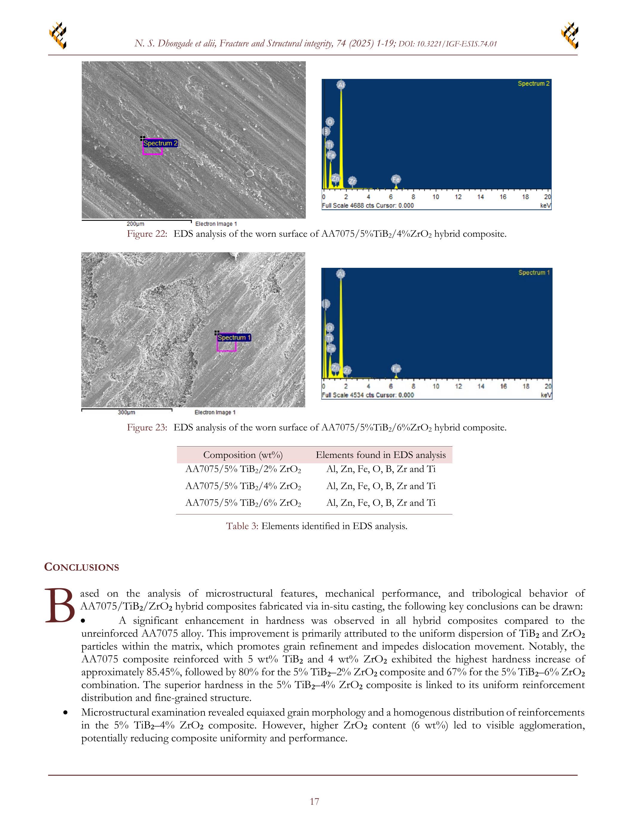 Based on the analysis of microstructural features, mechanical performance, and tribological behavior of AA7075/ TiB_(2)//ZrO_(2)\mathrm{TiB}_{2} / \mathrm{ZrO}_{2} hybrid composites fabricated via in-situ casting, the following key conclusions can be drawn: - A significant enhancement in hardness was observed in all hybrid composites compared to the unreinforced AA7075 alloy. This improvement is primarily attributed to the uniform dispersion of TiB_(2)\mathrm{TiB}_{2} and ZrO_(2)\mathrm{ZrO}_{2} particles within the matrix, which promotes grain refinement and impedes dislocation movement. Notably, the AA7075 composite reinforced with 5wt%TiB_(2)5 \mathrm{wt} \% \mathrm{TiB}_{2} and 4wt%ZrO_(2)4 \mathrm{wt} \% \mathrm{ZrO}_{2} exhibited the highest hardness increase of approximately 85.45%85.45 \%, followed by 80%80 \% for the 5%TiB_(2)-2%ZrO_(2)5 \% \mathrm{TiB}_{2}-2 \% \mathrm{ZrO}_{2} composite and 67%67 \% for the 5%TiB_(2)-6%ZrO_(2)5 \% \mathrm{TiB}_{2}-6 \% \mathrm{ZrO}_{2} combination. The superior hardness in the 5%TiB_(2)-4%ZrO_(2)5 \% \mathrm{TiB}_{2}-4 \% \mathrm{ZrO}_{2} composite is linked to its uniform reinforcement distribution and fine-grained structure.
