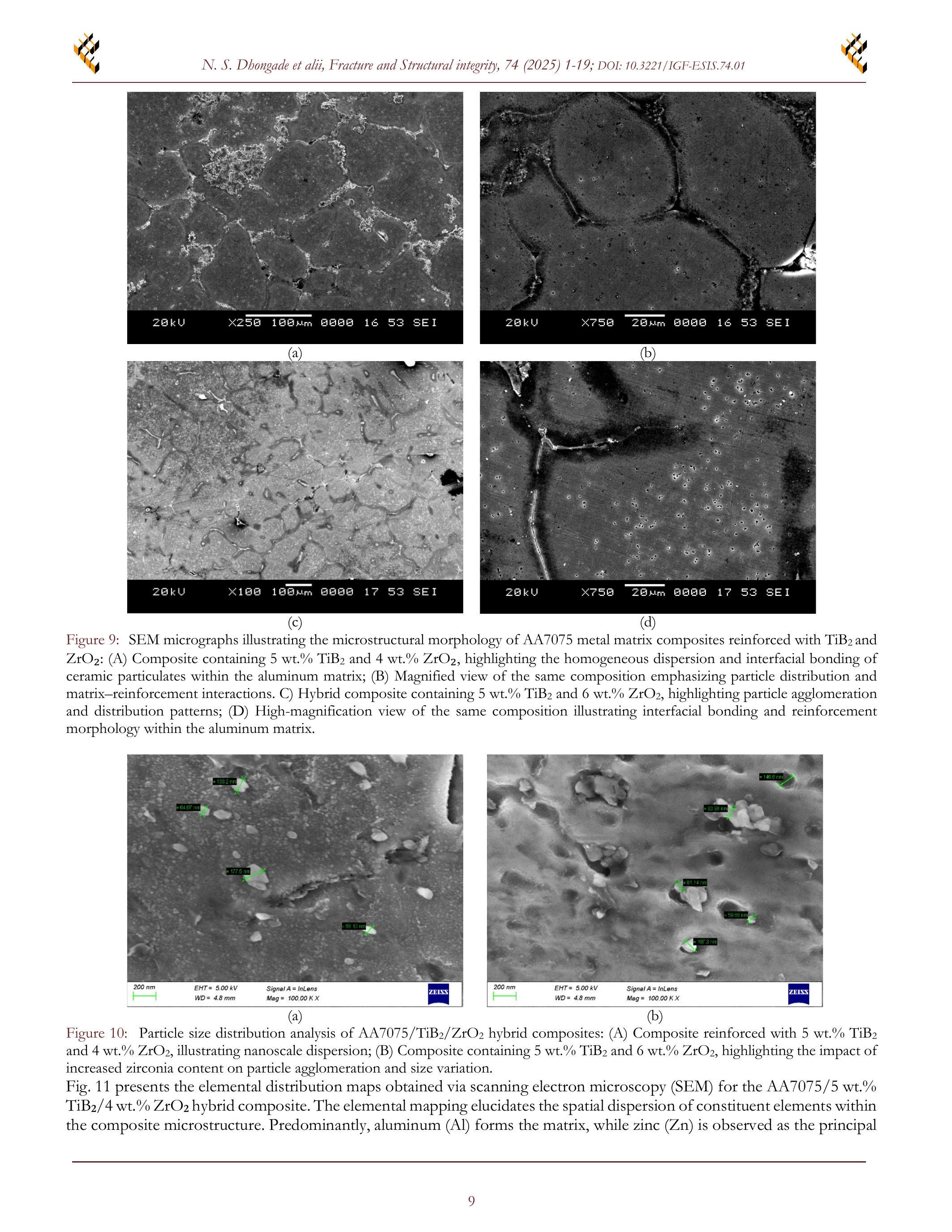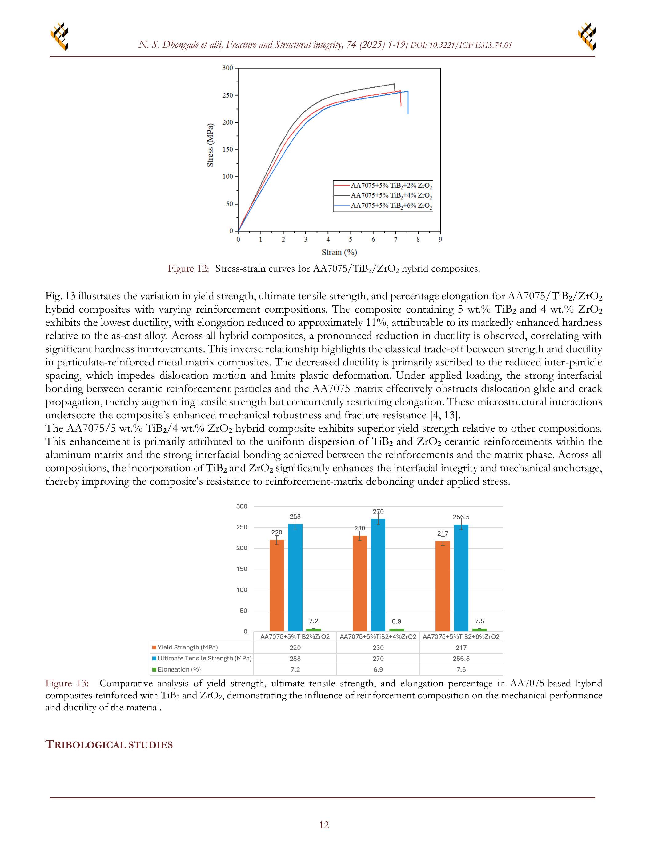The AA7075//5wt.%TiB_(2)//4wt.%ZrO_(2)\mathrm{AA} 7075 / 5 \mathrm{wt} . \% \mathrm{TiB}_{2} / 4 \mathrm{wt} . \% \mathrm{ZrO}_{2} hybrid composite exhibits superior yield strength relative to other compositions. This enhancement is primarily attributed to the uniform dispersion of TiB_(2)\mathrm{TiB}_{2} and ZrO_(2)\mathrm{ZrO}_{2} ceramic reinforcements within the aluminum matrix and the strong interfacial bonding achieved between the reinforcements and the matrix phase. Across all compositions, the incorporation of TiB_(2)\mathrm{TiB}_{2} and ZrO_(2)\mathrm{ZrO}_{2} significantly enhances the interfacial integrity and mechanical anchorage, thereby improving the composite's resistance to reinforcement-matrix debonding under applied stress.