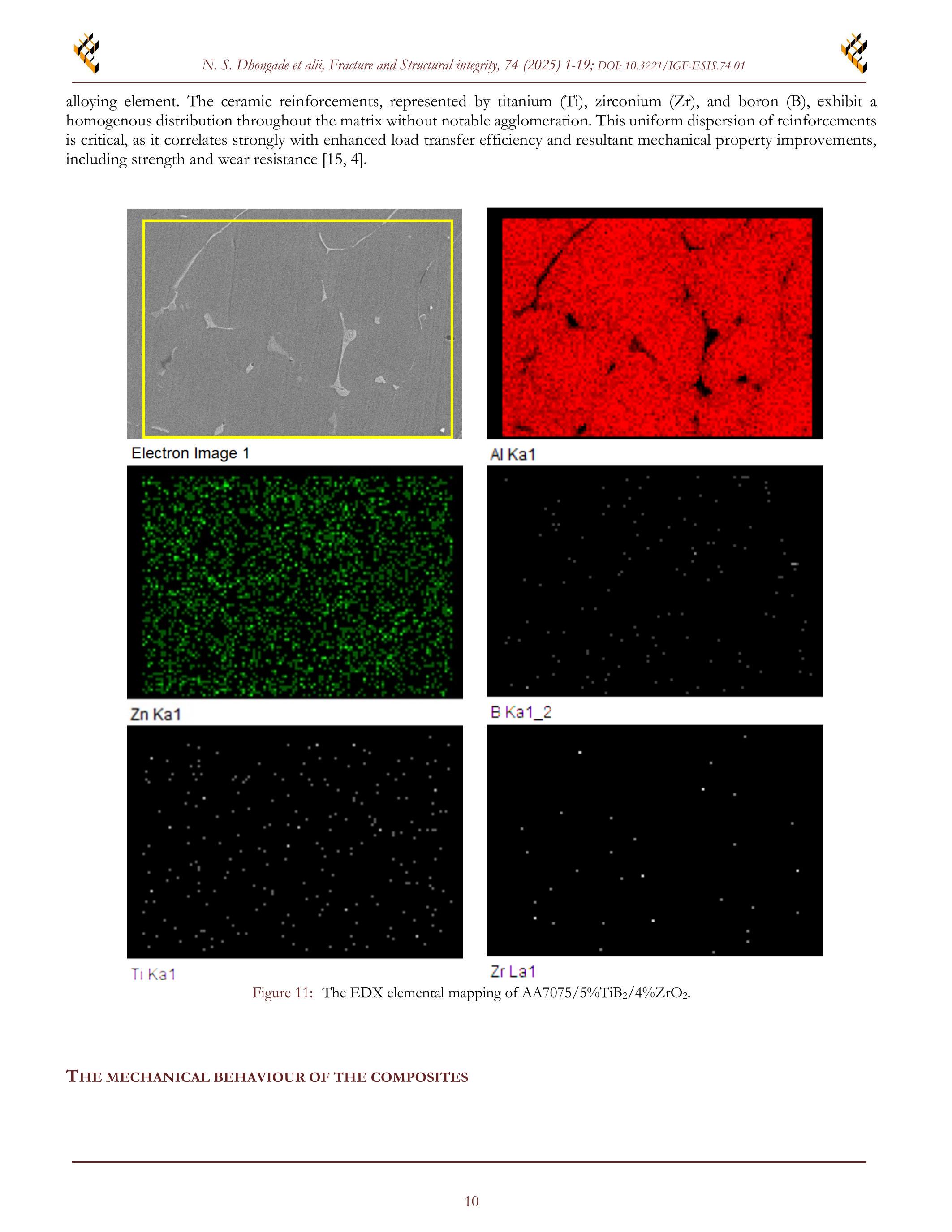alloying element. The ceramic reinforcements, represented by titanium (Ti), zirconium (Zr), and boron (B), exhibit a homogenous distribution throughout the matrix without notable agglomeration. This uniform dispersion of reinforcements is critical, as it correlates strongly with enhanced load transfer efficiency and resultant mechanical property improvements, including strength and wear resistance [15, 4].