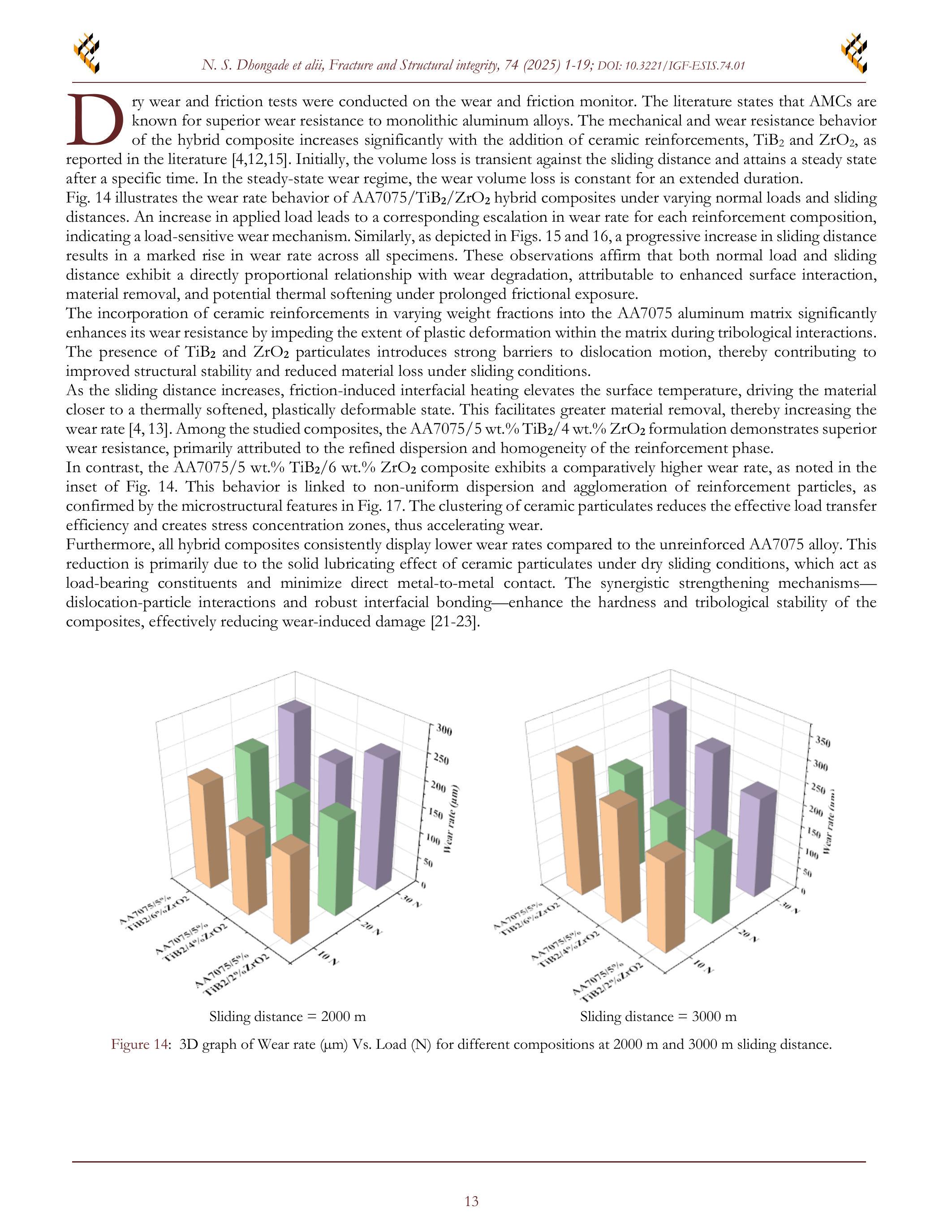 As the sliding distance increases, friction-induced interfacial heating elevates the surface temperature, driving the material closer to a thermally softened, plastically deformable state. This facilitates greater material removal, thereby increasing the wear rate [4,13][4,13]. Among the studied composites, the AA7075//5wt.%TiB_(2)//4wt.%ZrO_(2)\mathrm{AA} 7075 / 5 \mathrm{wt} . \% \mathrm{TiB}_{2} / 4 \mathrm{wt} . \% \mathrm{ZrO}_{2} formulation demonstrates superior wear resistance, primarily attributed to the refined dispersion and homogeneity of the reinforcement phase.