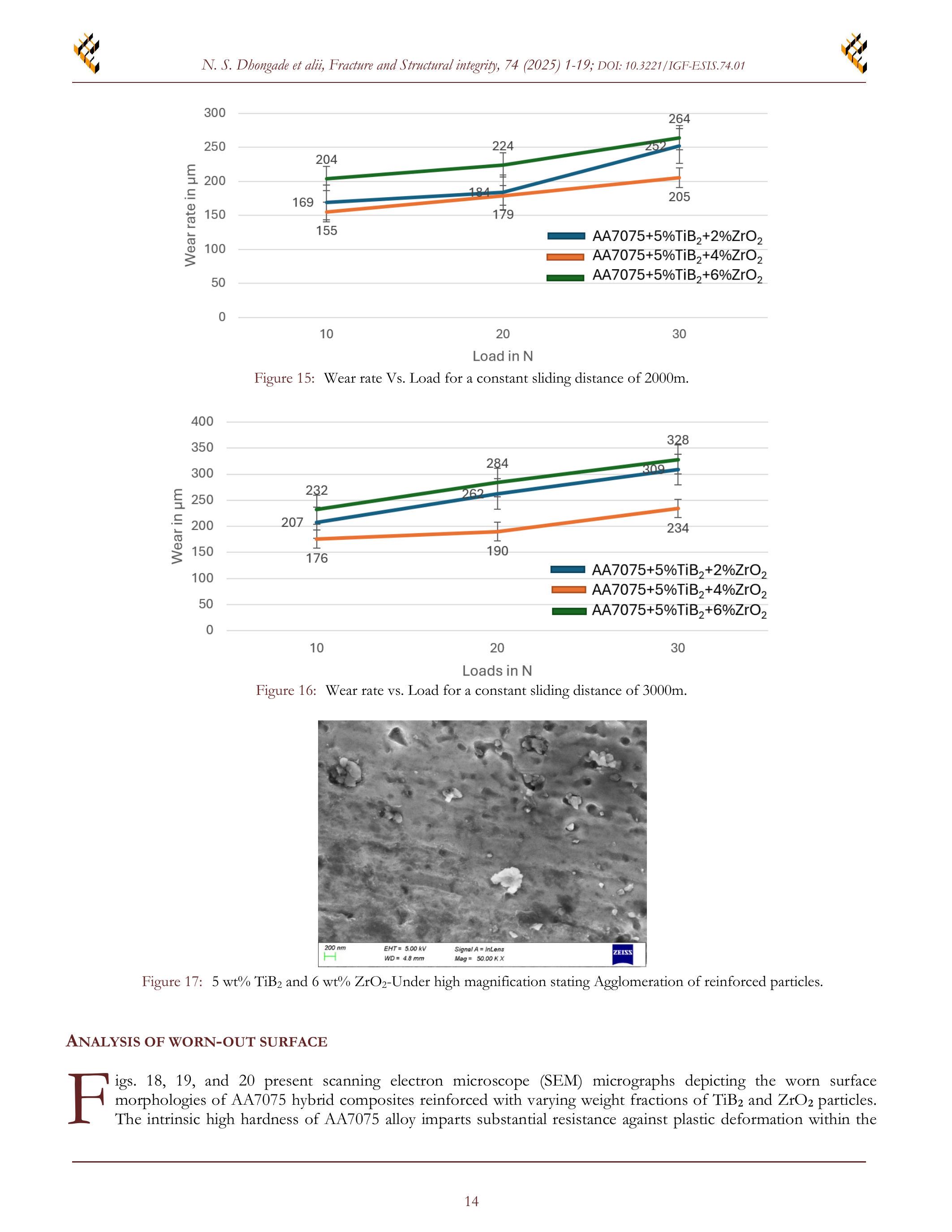 In contrast, the AA7075//5wt.%TiB_(2)//6wt.%ZrO_(2)\mathrm{AA} 7075 / 5 \mathrm{wt} . \% \mathrm{TiB}_{2} / 6 \mathrm{wt} . \% \mathrm{ZrO}_{2} composite exhibits a comparatively higher wear rate, as noted in the inset of Fig. 14. This behavior is linked to non-uniform dispersion and agglomeration of reinforcement particles, as confirmed by the microstructural features in Fig. 17. The clustering of ceramic particulates reduces the effective load transfer efficiency and creates stress concentration zones, thus accelerating wear.