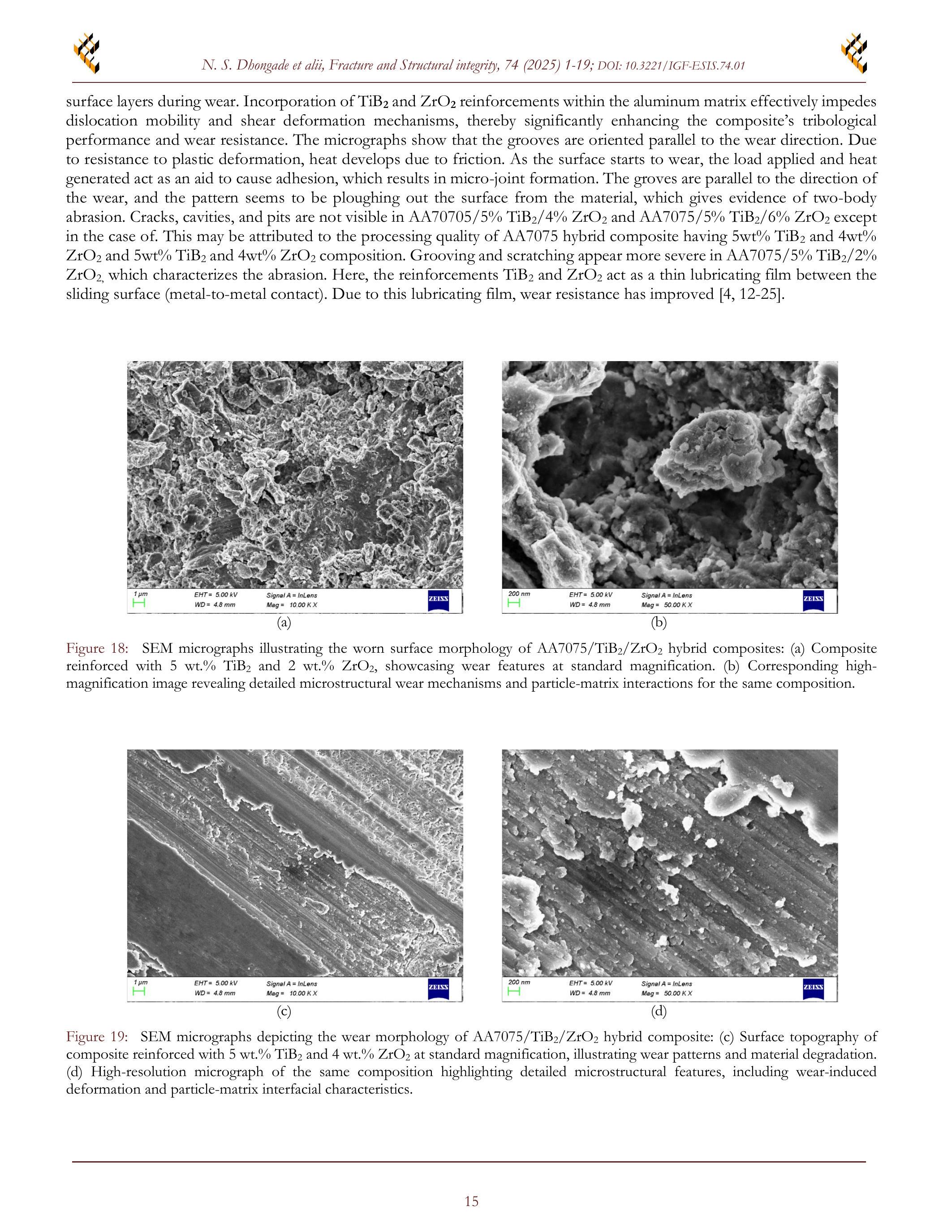 surface layers during wear. Incorporation of TiB_(2)\mathrm{TiB}_{2} and ZrO_(2)\mathrm{ZrO}_{2} reinforcements within the aluminum matrix effectively impedes dislocation mobility and shear deformation mechanisms, thereby significantly enhancing the composite's tribological performance and wear resistance. The micrographs show that the grooves are oriented parallel to the wear direction. Due to resistance to plastic deformation, heat develops due to friction. As the surface starts to wear, the load applied and heat generated act as an aid to cause adhesion, which results in micro-joint formation. The groves are parallel to the direction of the wear, and the pattern seems to be ploughing out the surface from the material, which gives evidence of two-body abrasion. Cracks, cavities, and pits are not visible in AA70705//5%TiB_(2)//4%ZrO_(2)\mathrm{AA} 70705 / 5 \% \mathrm{TiB}_{2} / 4 \% \mathrm{ZrO}_{2} and AA7075//5%TiB_(2)//6%ZrO_(2)\mathrm{AA} 7075 / 5 \% \mathrm{TiB}_{2} / 6 \% \mathrm{ZrO}_{2} except in the case of. This may be attributed to the processing quality of AA7075 hybrid composite having 5wt^(%)TiB_(2)5 \mathrm{wt}^{\%} \mathrm{TiB}_{2} and 4wt^(%)%ZrO_(2)4 \mathrm{wt}^{\%} \% \mathrm{ZrO}_{2} and 5wt%TiB_(2)5 \mathrm{wt} \% \mathrm{TiB}_{2} and 4wt%ZrO_(2)4 \mathrm{wt} \% \mathrm{ZrO}_{2} composition. Grooving and scratching appear more severe in AA7075//5%TiB_(2)//2%ZrO_(2)\mathrm{AA} 7075 / 5 \% \mathrm{TiB}_{2} / 2 \% \mathrm{ZrO}_{2}, which characterizes the abrasion. Here, the reinforcements TiB_(2)\mathrm{TiB}_{2} and ZrO_(2)\mathrm{ZrO}_{2} act as a thin lubricating film between the sliding surface (metal-to-metal contact). Due to this lubricating film, wear resistance has improved [4, 12-25].