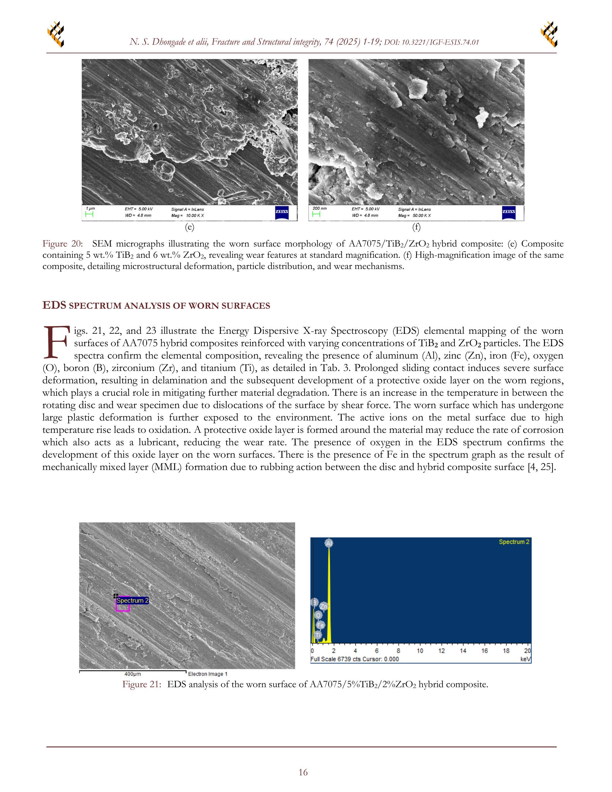 Figs. 21, 22, and 23 illustrate the Energy Dispersive X-ray Spectroscopy (EDS) elemental mapping of the worn surfaces of AA7075 hybrid composites reinforced with varying concentrations of TiB_(2)\mathrm{TiB}_{2} and ZrO_(2)\mathrm{ZrO}_{2} particles. The EDS spectra confirm the elemental composition, revealing the presence of aluminum ( Al ), zinc ( Zn ), iron ( Fe ), oxygen (O), boron (B), zirconium (Zr), and titanium (Ti), as detailed in Tab. 3. Prolonged sliding contact induces severe surface deformation, resulting in delamination and the subsequent development of a protective oxide layer on the worn regions, which plays a crucial role in mitigating further material degradation. There is an increase in the temperature in between the rotating disc and wear specimen due to dislocations of the surface by shear force. The worn surface which has undergone large plastic deformation is further exposed to the environment. The active ions on the metal surface due to high temperature rise leads to oxidation. A protective oxide layer is formed around the material may reduce the rate of corrosion which also acts as a lubricant, reducing the wear rate. The presence of oxygen in the EDS spectrum confirms the development of this oxide layer on the worn surfaces. There is the presence of Fe in the spectrum graph as the result of mechanically mixed layer (MML) formation due to rubbing action between the disc and hybrid composite surface [4, 25].
